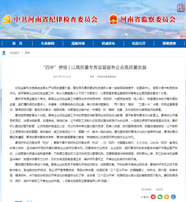 省紀(jì)委監(jiān)委網(wǎng)站刊登服務(wù)區(qū)公司文章 《以高質(zhì)量專責(zé)監(jiān)督服務(wù)企業(yè)高質(zhì)量發(fā)展》