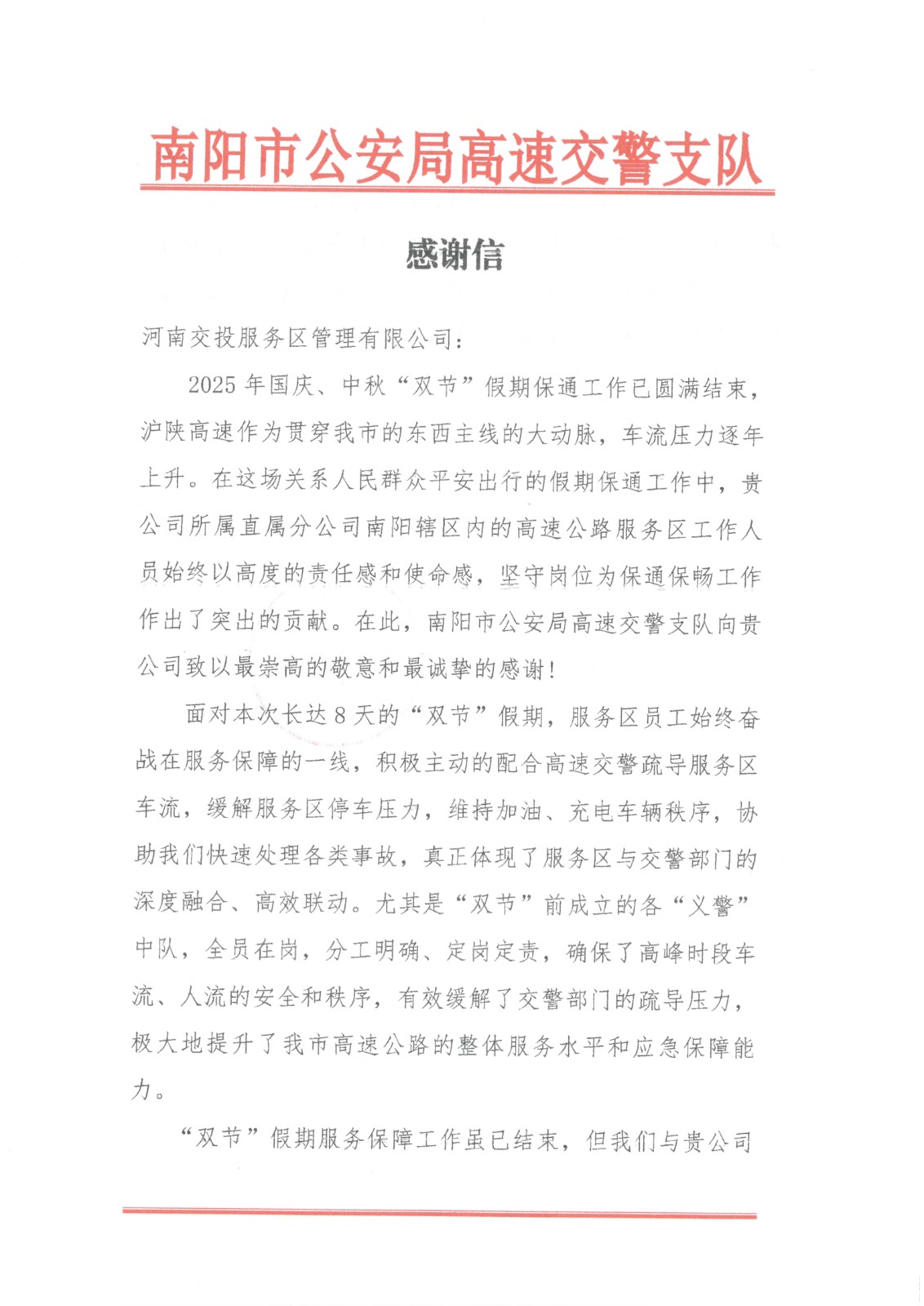 2025-10-14 作者:10月10日,南陽市公安局高速交警支隊(duì)向公司所屬直屬分公司寄來感謝信,表達(dá)對(duì)南陽轄區(qū)內(nèi)服務(wù)區(qū)、停車區(qū)國慶中秋“雙節(jié)”期間積極配合做好保通保暢工作的崇高敬意和誠摯感謝。