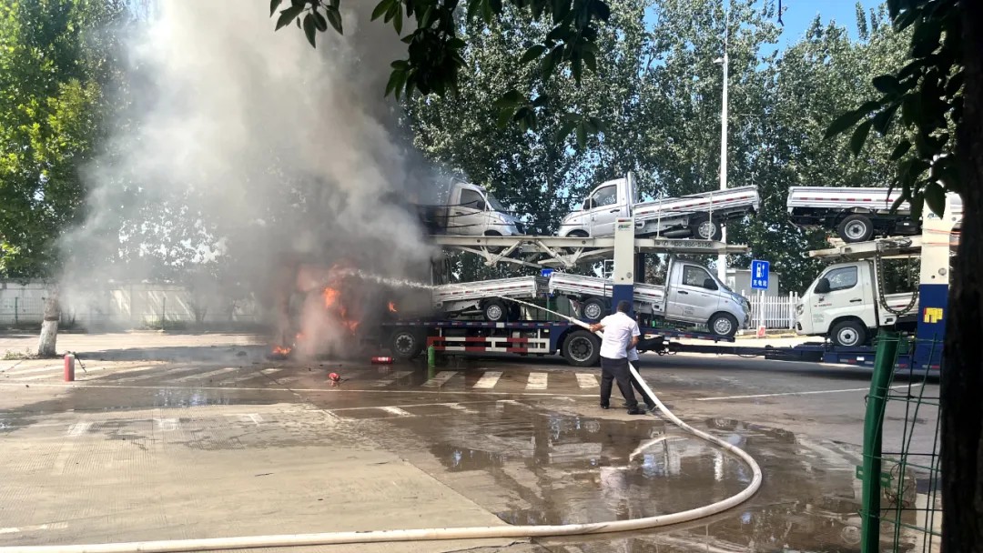 7月20日下午14:35分,靈寶服務區值班經理在巡查時發現北區后廣場濃煙滾滾、一裝載有8輛小型貨車的大貨車駕駛艙內著火并快速蔓延。