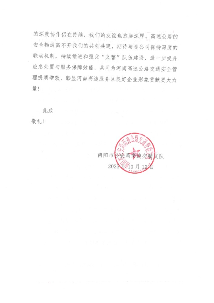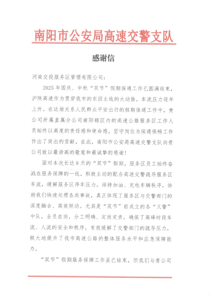 10月10日,南陽市公安局高速交警支隊向公司所屬直屬分公司寄來感謝信,表達對南陽轄區內服務區、停車區國慶中秋“雙節”期間積極配合做好保通保暢工作的崇高敬意和誠摯感謝。